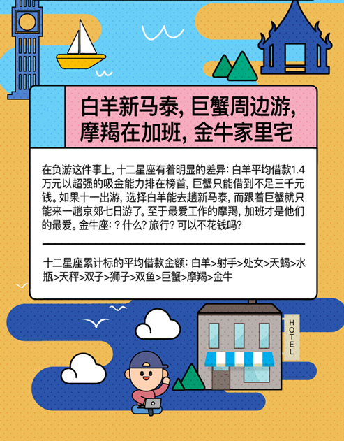 這個十一跟誰走呢?不要再為這個問題苦惱了。根據(jù)《借錢旅行大數(shù)據(jù)報告》,白羊座累計(jì)能夠借到超過1.4萬元,而巨蟹座則累計(jì)能借到不足三千元錢,而單次能借到錢則不足千元。這個十一長假,跟著白羊座能夠去一趟新馬泰,而跟著巨蟹座或許只能來一趟京郊一日游。