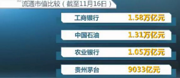 11月16日,A股"股王"貴州茅臺股價再創(chuàng)新高。最高漲至719.96元,最終以719.11元報收,漲幅達4.51%,總市值達9033億元,在A股公司中位居第八。如果按流通市值計算,貴州茅臺已躍居第四,僅次于工商銀行、中國石油和農(nóng)業(yè)銀行。