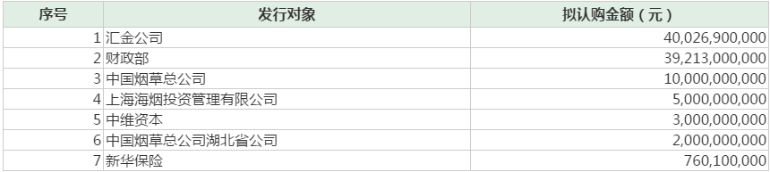 從各發(fā)行對象來看,除去匯金公司和財政部,其余的發(fā)行對象中,上海海煙投資管理有限公司與中維資本兩家均為中國煙草集團(tuán)背景公司,再加上中國煙草總公司、中國煙草總公司湖北省公司,“中煙系”法人占到四席。
