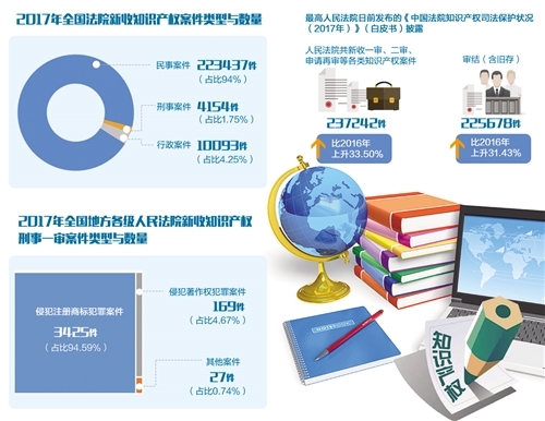 最高人民法院日前發(fā)布的《中國(guó)法院知識(shí)產(chǎn)權(quán)司法保護(hù)狀況(2017年)》(白皮書(shū))披露,2017年,人民法院共新收一審、二審、申請(qǐng)?jiān)賹彽雀黝?lèi)知識(shí)產(chǎn)權(quán)案件237242件,審結(jié)225678件(含舊存),比2016年分別上升33.50%和31.43%。