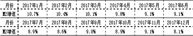 注2:2018年1月,人民銀行完善貨幣供應量中貨幣市場基金部分的統(tǒng)計方法,用非存款機構部門持有的貨幣市場基金取代貨幣市場基金存款(含存單)。完善后,2017年各月末M2增速如下: