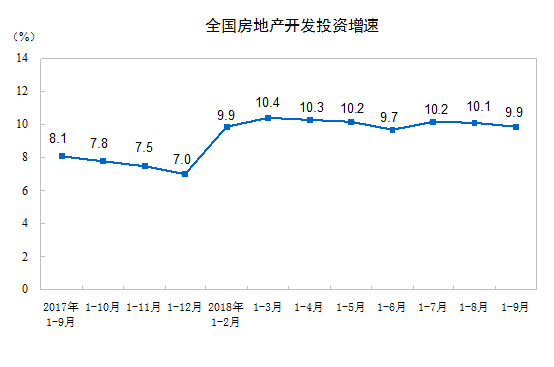 從房地產(chǎn)開發(fā)投資完成情況看,2018年1-9月份,全國房地產(chǎn)開發(fā)投資88665億元,同比增長9.9%,增速比1-8月份回落0.2個百分點。其中,住宅投資62806億元,增長14.0%,增速回落0.1個百分點。住宅投資占房地產(chǎn)開發(fā)投資的比重為70.8%。