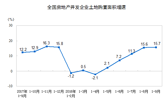 1-9月份,房地產(chǎn)開發(fā)企業(yè)土地購置面積19366萬平方米,同比增長15.7%,增速比1-8月份提高0.1個百分點;土地成交價款10002億元,增長22.7%,增速回落1個百分點。