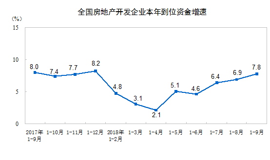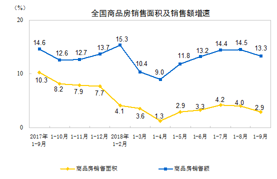 央廣網(wǎng)北京10月19日消息,國家統(tǒng)計局今日發(fā)布2018年1-9月份全國房地產(chǎn)開發(fā)投資和銷售情況。數(shù)據(jù)顯示,2018年1-9月份,全國房地產(chǎn)開發(fā)投資88665億元,同比增長9.9%,增速比1-8月份回落0.2個百分點;商品房銷售面積119313萬平方米,同比增長2.9%,增速比1-8月份回落1.1個百分點;1-9月份,房地產(chǎn)開發(fā)企業(yè)到位資金121882億元,同比增長7.8%,增速比1-8月份提高0.9個百分點。