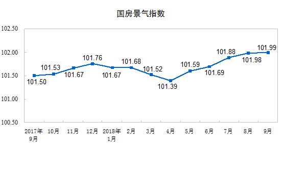 9月份,房地產(chǎn)開發(fā)景氣指數(shù)(簡稱“國房景氣指數(shù)”)為101.99,比8月份提高0.01點。