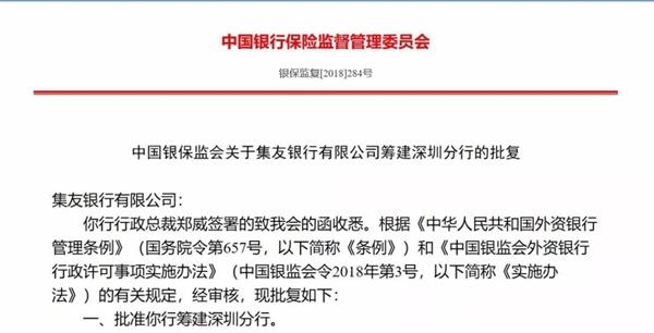 集友銀行1947年在香港注冊開業(yè),是香港第39家領(lǐng)有執(zhí)照的銀行。在對集友銀行的批文中,銀保監(jiān)會要求:自該行接到批文之日起15日內(nèi)到屬地銀行保險監(jiān)督管理機構(gòu)領(lǐng)取開業(yè)申請表,并按有關(guān)規(guī)定開展深圳分行的籌建工作。