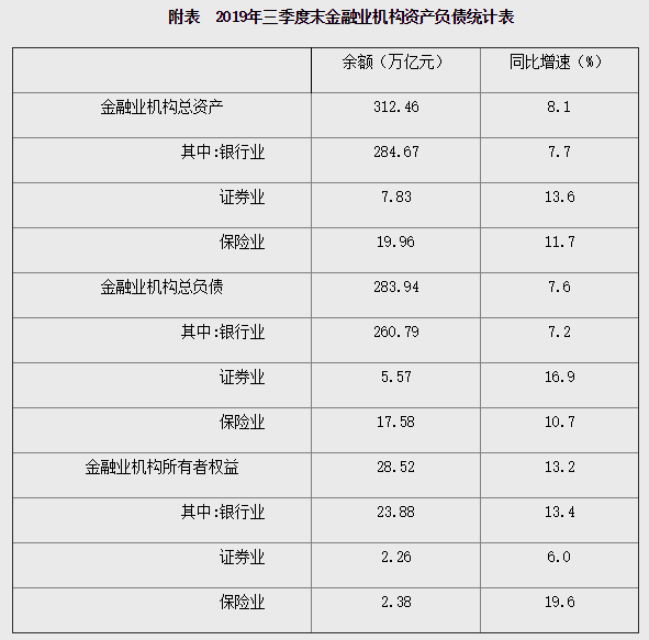 初步統(tǒng)計(jì),2019年三季度末,我國金融業(yè)機(jī)構(gòu)總資產(chǎn)為312.46萬億元,同比增長8.1%,其中,銀行業(yè)機(jī)構(gòu)總資產(chǎn)為284.67萬億元,同比增長7.7%;證券業(yè)機(jī)構(gòu)總資產(chǎn)為7.83萬億元,同比增長13.6%;保險(xiǎn)業(yè)機(jī)構(gòu)總資產(chǎn)為19.96萬億元,同比增長11.7%。