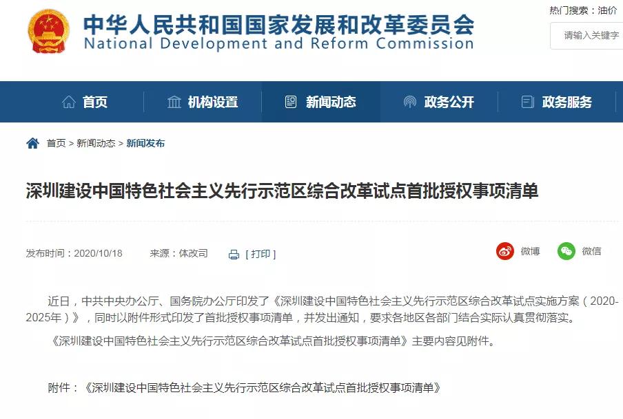 據(jù)國(guó)家發(fā)改委網(wǎng)站10月18日正式發(fā)布的《深圳建設(shè)中國(guó)特色社會(huì)主義先行示范區(qū)綜合改革試點(diǎn)首批授權(quán)事項(xiàng)清單》顯示,首批授權(quán)事項(xiàng)清單共有六大類40條。