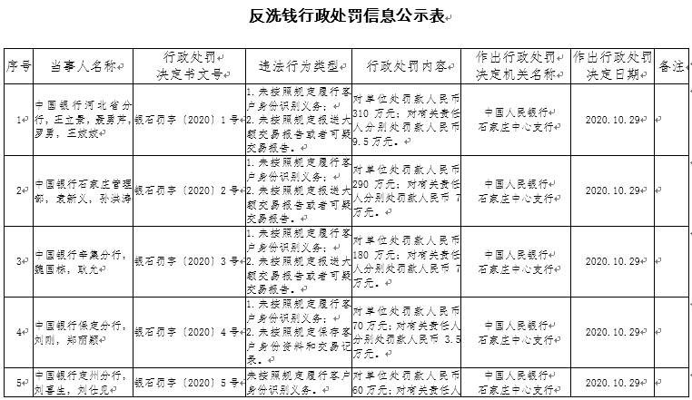 除了上述機(jī)構(gòu),公示表顯示,因中國郵政儲(chǔ)蓄銀行石家莊市分行及有關(guān)負(fù)責(zé)人未按照規(guī)定履行客戶身份識(shí)別義務(wù),監(jiān)管部門對單位處罰款126萬元,對兩位有關(guān)責(zé)任人分別處罰款3.4萬元;因上海浦東發(fā)展銀行石家莊分行及有關(guān)負(fù)責(zé)人未按照規(guī)定履行客戶身份識(shí)別義務(wù),監(jiān)管部門對單位處罰款100萬元,對兩位有關(guān)責(zé)任人分別處罰款5萬元。