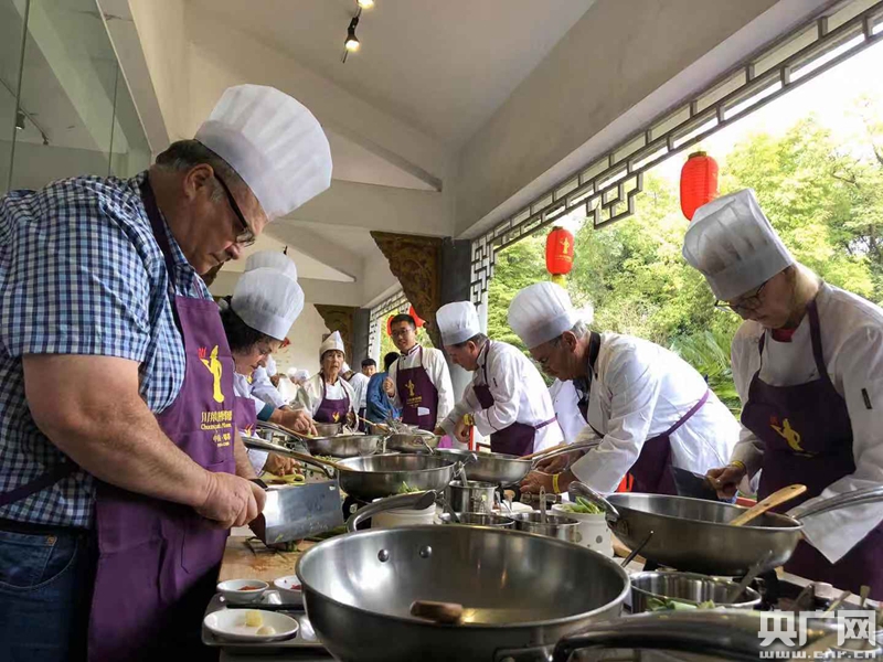 在川菜博物館內(nèi)學(xué)習(xí)川菜制作的外國游客(中央廣播電視總臺央廣記者 張慧娟 攝)