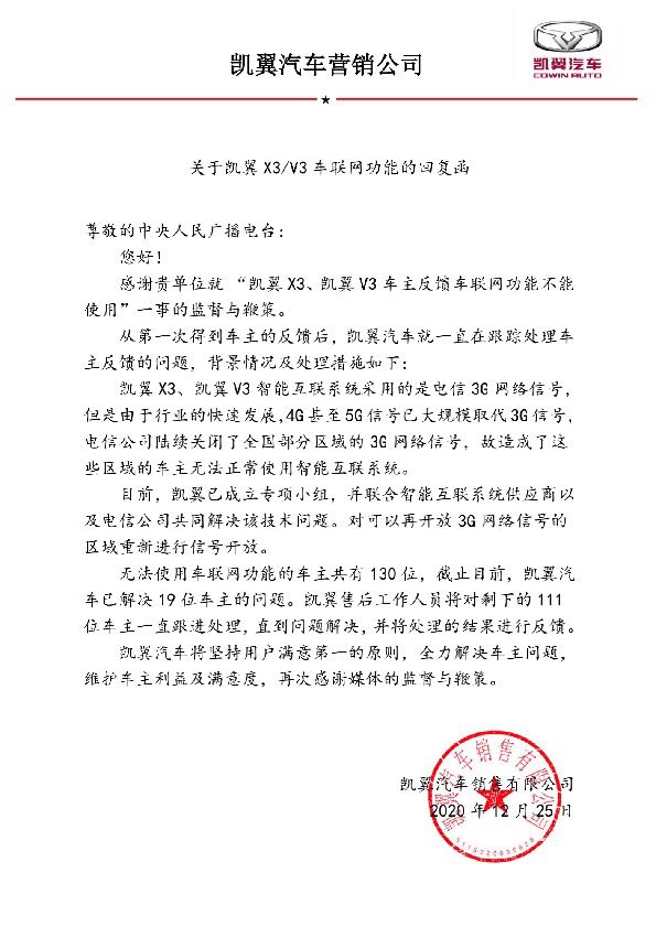 節(jié)目播出后,凱翼汽車銷售有限公司發(fā)來回復(fù)函表示,凱翼X3、凱翼V3智能互聯(lián)系統(tǒng)無法正常使用,是由于全國部分區(qū)域已經(jīng)無法正常使用3G網(wǎng)絡(luò)信號(hào)。