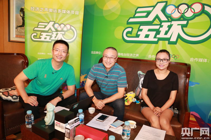 主持人王冠、財(cái)經(jīng)評(píng)論人水皮和央視女主播王曦梁一起暢聊奧運(yùn)(央廣記者安健 攝)