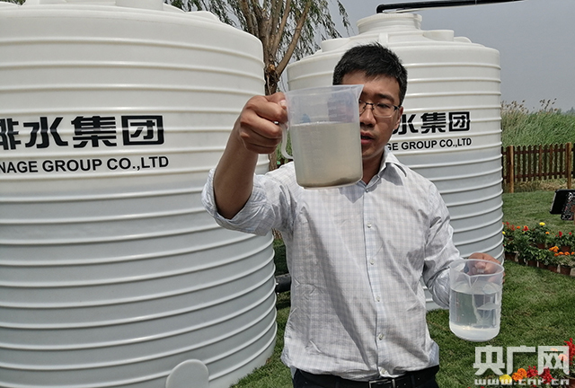 圖為污水處理前后對(duì)比,處理后水質(zhì)明顯改善。(央廣記者 佟亞濤 攝)