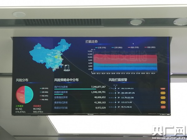 大屏幕上顯示,早上8點半,當(dāng)天車票開售2個半小時,就已經(jīng)接到近180億次訪問請求,其中正常請求86億次,風(fēng)險請求超過90億次。