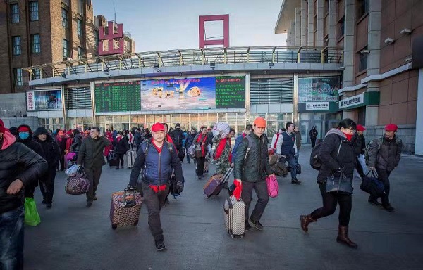 返鄉(xiāng)務工人員離開火車站前往站內(nèi)客車乘車點(中鐵哈爾濱局供圖)
