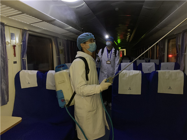 工作人員對(duì)每輛車進(jìn)行消毒,經(jīng)常工作到凌晨(央廣網(wǎng)發(fā) 中國(guó)鐵路成都局供圖)