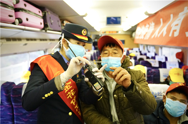 乘務(wù)人員為乘客測(cè)量體溫,當(dāng)日,近500名云南籍務(wù)工人員乘坐專列前往廣州(央廣網(wǎng)發(fā) 中國(guó)鐵路昆明局供圖)