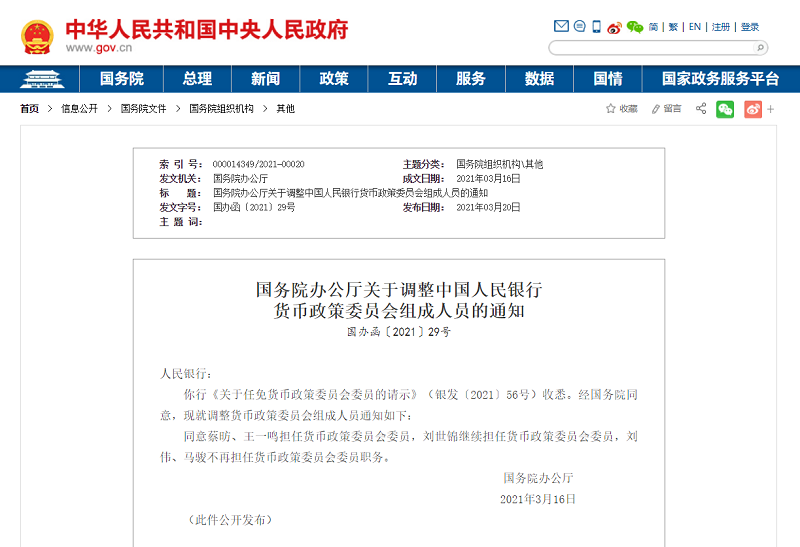 央廣網(wǎng)北京3月23日消息(記者蔣勇)據(jù)中央廣播電視總臺經(jīng)濟之聲《天下財經(jīng)》報道,國務(wù)院辦公廳近日發(fā)布通知,同意中國社會科學(xué)院國家高端智庫首席專家蔡昉、中國國際經(jīng)濟交流中心副理事長王一鳴擔(dān)任貨幣政策委員會委員,中國發(fā)展研究基金會副理事長劉世錦繼續(xù)擔(dān)任貨幣政策委員會委員,中國人民大學(xué)校長劉偉、清華大學(xué)金融與發(fā)展研究中心主任馬駿不再擔(dān)任貨幣政策委員會委員職務(wù)。