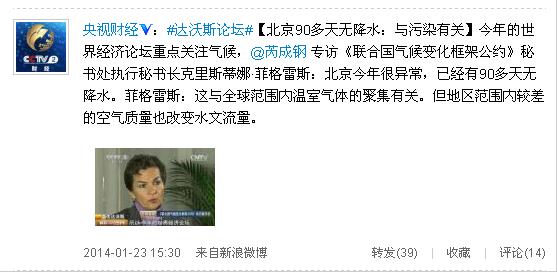 #達沃斯論壇#【北京90多天無降水:與污染有關】今年的世界經濟論壇重點關注氣候,@芮成鋼專訪《聯(lián)合國氣候變化框架公約》秘書處執(zhí)行秘書長克里斯蒂娜·菲格雷斯:北京今年很異常,已經有90多天無降水。菲格雷斯:這與全球范圍內溫室氣體的聚集有關。但地區(qū)范圍內較差的空氣質量也改變水文流量。