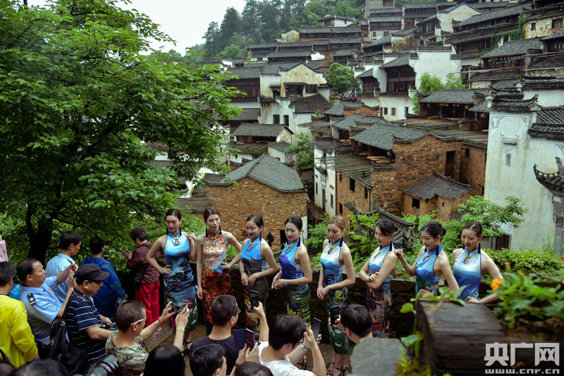 為迎接這一中國旅游業(yè)的重要節(jié)日,婺源篁嶺將四季風(fēng)光中的“油菜花、曬秋、紅楓、鮮花小鎮(zhèn)”等主題元素印制在中國特色的旗袍服飾上;顒(dòng)中,八位佳人身穿印有篁嶺風(fēng)光的旗袍,踏著優(yōu)雅的步伐,佳人的到來,讓原本下著小雨的篁嶺,一下子有了勃勃的生機(jī),佳人們時(shí)而手持團(tuán)扇翩翩起舞,時(shí)而駐足展示篁嶺風(fēng)光,吸引了眾多的游客朋友,其中不乏有國外友人。