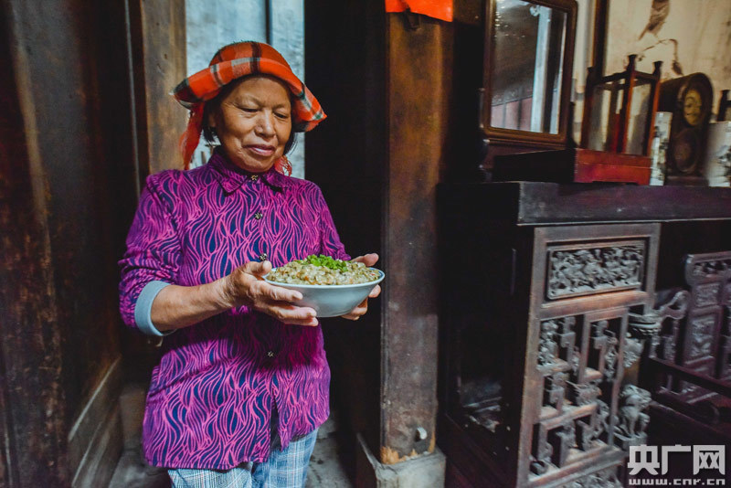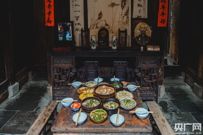 在婺源,篁嶺就是山鄉(xiāng)煙火人家。篁嶺的土灶煙火,一次次溫暖日漸蒼老的記憶。五桂堂的炊煙隨風(fēng)飄散,但這方土灶卻在游子心里刻上烙印!兑蛔篮蔑垺窙]有天然氣,沒有高壓鍋,只有文火慢燉,慢工細(xì)活。一桌好飯,吃的是平日無處可尋的農(nóng)家土味,吃的是余音繞梁的鄉(xiāng)愁。曬秋大媽曹家弟表示,“做一桌好飯看到游客們吃得滿心歡喜,就是對(duì)我最大的鼓勵(lì)!”