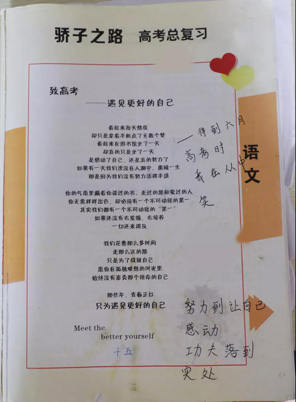 為了高考,小姑娘準備了很久,在她練習冊的第一頁,她寫下了“待到六月高考時,我在叢中笑”和“努力到讓自己感動,功夫落到實處!倍@樣的情況,不僅讓她自己也讓她家人和老師不知所措。