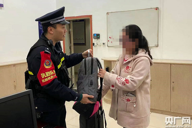 當(dāng)日8時(shí)50分許,又是在車站東安檢查?,民警同樣幫旅客秦女士找回來(lái)遺落在安檢機(jī)上的行李包。