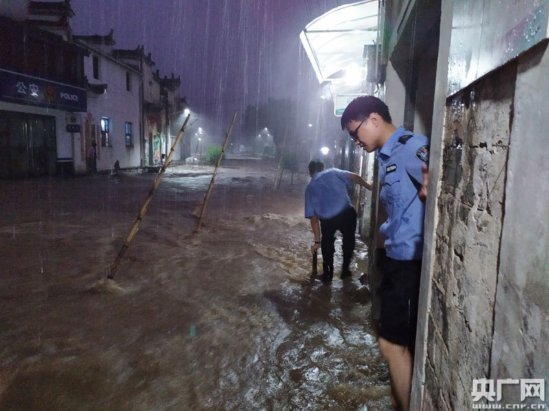 當晚7時許,沱川鄉(xiāng)的強降雨已持續(xù)了4個多小時,洪水造成理坑村及沿河村落被淹,村下村敬老院附近電箱損壞,學?盏乇谎蜎]。面對突發(fā)的災情,沱川派出所立即啟動防汛處置應急預案,調(diào)集全部警力,所長張小波帶隊,奔赴災區(qū),疏通水毀道路、搶救受災財物、轉(zhuǎn)移被困群眾。