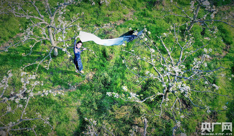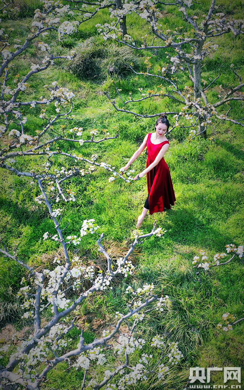 舞蹈愛(ài)好者在梨花林里,翩翩起舞(央廣網(wǎng)發(fā) 通訊員田俊/攝)