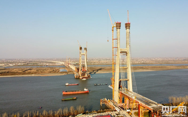 此次封頂?shù)?號墩主塔位于九江側(cè)永安堤防護堤邊坡上,為H型結(jié)構(gòu),高達242米,相當(dāng)于80層樓房高。采用液壓爬模分段施工,塔柱共41個節(jié)段,混凝土澆筑總方量為3.17萬立方米。