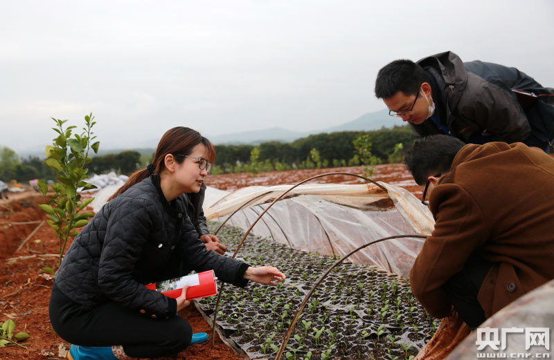 劉旸瑒(左)和工作隊(duì)隊(duì)員一起查看西瓜秧苗生長(zhǎng)情況