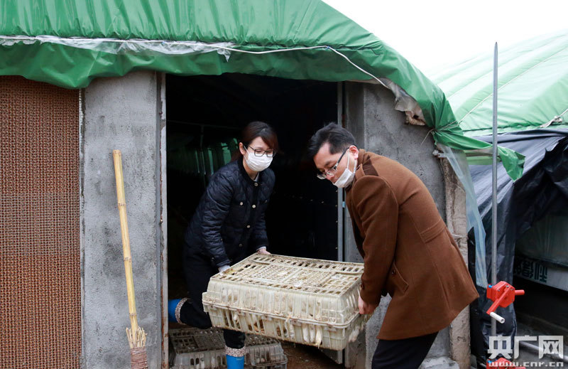 劉旸瑒(左)和工作隊(duì)隊(duì)員一起將裝好籠的商品雞抬出裝車
