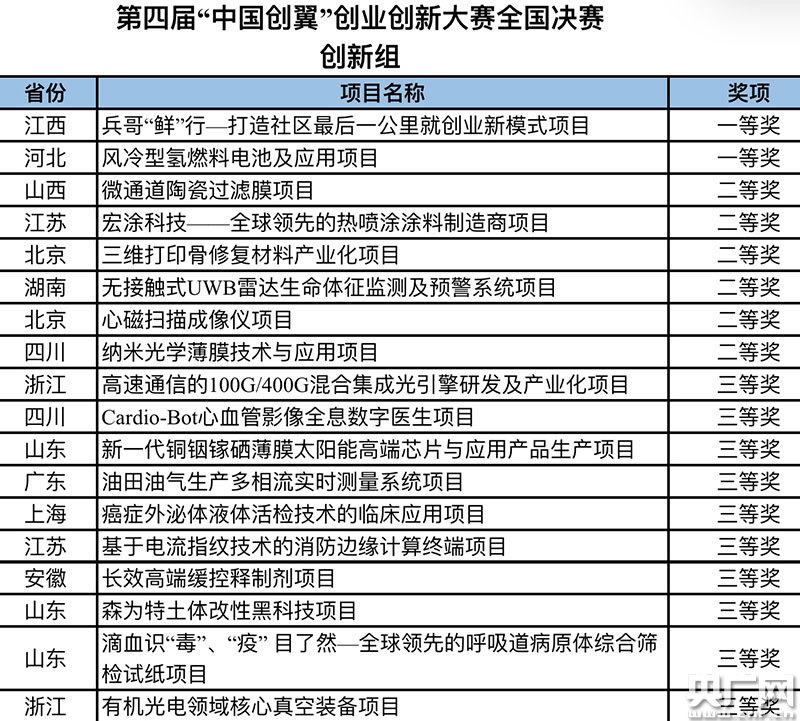 第四屆“中國(guó)創(chuàng)翼”創(chuàng)業(yè)創(chuàng)新大賽全國(guó)總決賽創(chuàng)新組一、二、三等獎(jiǎng)