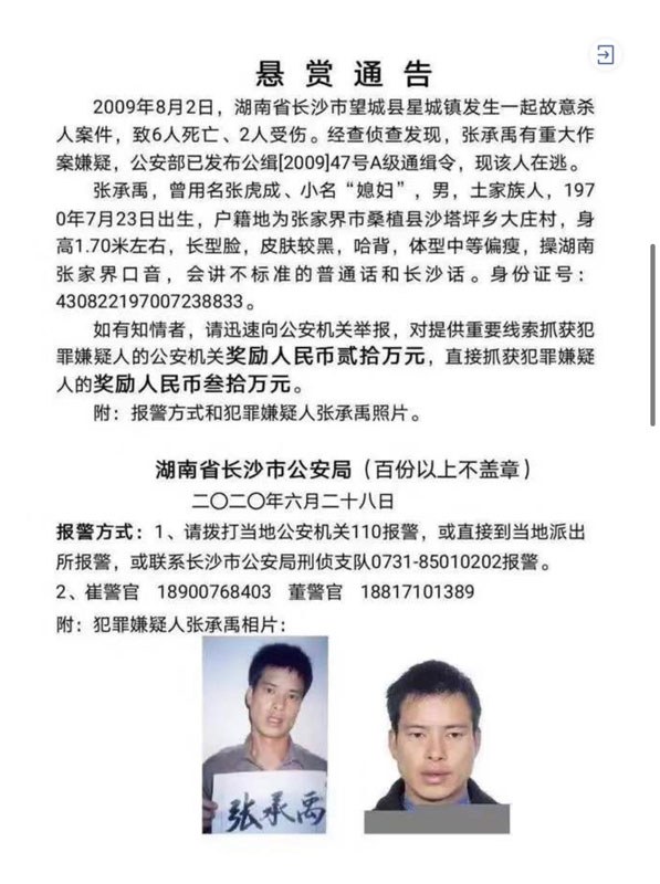 據(jù)2020年6月28日湖南省長沙市公安局發(fā)布的懸賞公告顯示,張承禹,曾用名張虎成,小名“媳婦”,男,土家族人,1970年7月23日出生,戶籍地為張家界市桑植縣沙塔坪鄉(xiāng)大莊村,身高1.70米左右,長型臉,皮膚較黑,哈背,體型中等偏瘦,操湖南張家界口音,會講不標準的普通話和長沙話。