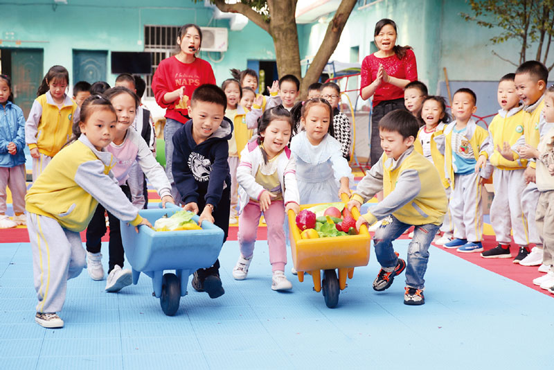 江西堅(jiān)持以人民為中心的發(fā)展思想,加快教育、文化、衛(wèi)生、體育等社會(huì)事業(yè)發(fā)展,更好滿足人民美好生活需要。圖為2020年10月14日,江西省峽江縣幼兒園通過參加搬運(yùn)瓜果、冬瓜舉重等趣味比賽,提高孩子們熱愛勞動(dòng)、愛惜糧食的意識(shí)。 人民圖片 陳福平/攝