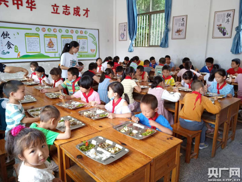 “開飯嘍!”伴隨著食堂廚師的一聲吆喝,孩子們迅速將課桌上的書本、文具收拾干凈,接過盤子和筷子,排隊到講臺打飯。老師們負責給各自班級的孩子們打飯,平時習慣在黑板上寫粉筆字的他們,打起飯來也毫不含糊,一邊熟練地將飯菜足量盛到孩子們的盤子里,一邊問他們夠不夠,鼓勵他們要吃飽。