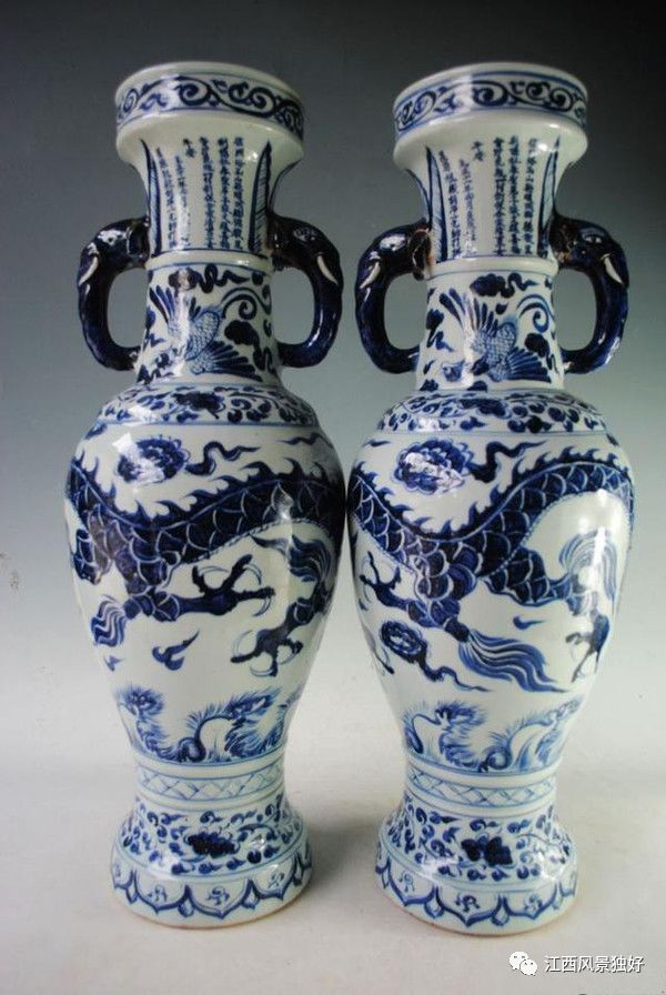 英國大維德基金會收藏。至正十一年(1351)景德鎮(zhèn)出品的青花龍紋大瓶,此瓶成對,均有傷殘且器形歪斜,一只高63.3厘米,直徑21厘米;另一只高63.6厘米,寬22厘米,器型復(fù)雜,形體又大;九層紋飾,順序?yàn)槔p枝扁菊、蕉葉、飛鳳靈芝、纏枝蓮、四爪云龍、海濤、纏枝牡丹和覆蓮雜寶,耳飾,幾乎囊括元青花繪畫內(nèi)容的全部,此后凡是層次多、繪制內(nèi)容相仿佛的元青花,都被統(tǒng)稱為“至正型”,影響力極為深遠(yuǎn)。