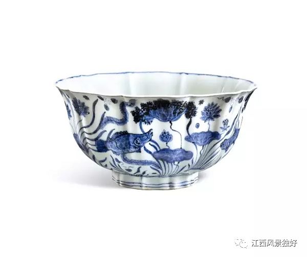 宣德時(shí)期的魚藻紋多繪鯖、鲌、鰱、鱖游魚四尾,諧音寓意“清白廉潔”。此碗繪鯖、魴、鱖三種游魚,與蓮花相組合,寓意“清廉”、“廉潔”,代表儒家思想中正直君子的完美形象。蓮花出污泥而不染,也是清白、純凈的象征。又魚與余同音,為富貴有余的象征,與蓮塘組合含“連年有余”之吉祥寓意,體現(xiàn)了中國自古以來特有的吉祥文化。明宣德青花魚藻紋十棱菱口大碗在2017年4月香港蘇富比拍賣會上以2.29億港元拍賣成交。