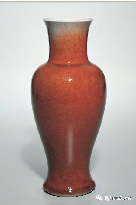 清康熙四十四年至五十一年(1705-1712),江西巡撫郎廷極奉派前往景德鎮(zhèn)御窯廠管理燒造事宜,生產(chǎn)的瓷器中有一種遙仿自宣德的紅釉器,色澤鮮艷,特別引人注目。因是郎廷極監(jiān)造之下的產(chǎn)物,所以稱為“郎窯紅”。此瓶形制和觀音手持之凈瓶相似,故又有觀音尊之稱。瓶口不規(guī)則的脫釉,則是郎窯紅作品的典型風(fēng)格。觀音尊器形優(yōu)美勻稱,釉色鮮紅,光彩奪目。此瓶釉質(zhì)純凈肥潤,玻璃質(zhì)感極強(qiáng)。口沿及底足處有一圈白色邊緣,俗稱“燈草邊”。瓶的內(nèi)壁施白釉,白色純正,類雪似銀,與器表的鮮紅色形成強(qiáng)烈的對比,相映成趣,是一件成功的紅釉之作。