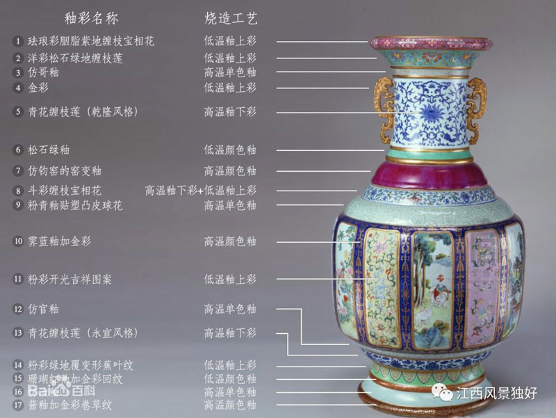 清乾隆各種釉彩大瓶,清代乾隆年間燒制,高86.4厘米,口徑27.4厘米,足徑33厘米。器身自上而下裝飾的釉、彩達(dá)17層之多,其標(biāo)志著中國古代制瓷工藝的頂峰,享有“中華瓷母”的美稱,F(xiàn)藏北京故宮博物院。