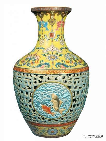 分為內(nèi)外兩瓶。內(nèi)外于瓶頸相連,內(nèi)瓶底部與外瓶內(nèi)心連接,外瓶瓶身鯉魚圖案栩栩如生,配以鏤空水波紋雕花設(shè)計(jì),顯得雍容富貴,瓶頸上紅色“吉”字蘊(yùn)含吉祥如意,由外部可以看到內(nèi)瓶繪制的青花圖案。該品內(nèi)繪青花,外畫洋彩、琺瑯彩、粉彩,運(yùn)用描金,鏤空、轉(zhuǎn)心、浮雕、淺刻等多種工藝,極盡奢華、嘆為觀止,屬于清三代瓷器中的巔峰之作。乾隆粉彩鏤空“吉慶有余”轉(zhuǎn)心瓶在2010年11月11日的倫敦的拍賣中以折合人民幣5.541億元的價(jià)格成交。