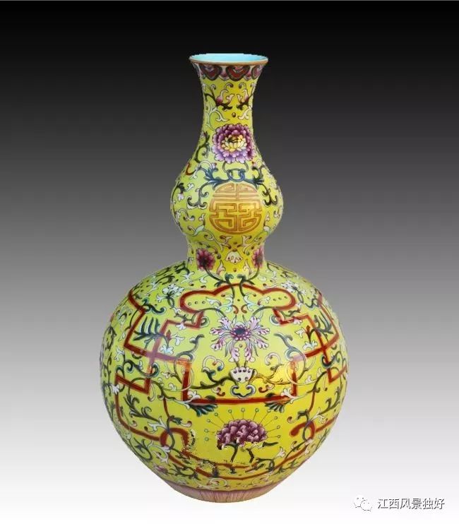 清代,當(dāng)景德鎮(zhèn)御瓷工匠采納及熟習(xí)乾隆初年開創(chuàng)的繪畫技藝后,一種奢華繁縟的裝飾工藝——“軋道錦地”備受推崇。這種以細(xì)針狀物在釉面上刻畫卷草紋、鳳尾紋和花卉紋以表現(xiàn)“錦地”效果的工藝,于景德鎮(zhèn)日臻完善。這只長頸葫蘆瓶就是這一時(shí)期的杰作。瓶上所繪紋飾色澤艷麗多變,重疊交錯(cuò),構(gòu)圖精巧,細(xì)致繽紛。該瓶在2010年10月7日香港蘇富比舉行的中國瓷器及工藝品拍賣會上,經(jīng)過足足45口叫價(jià),最終被香港收藏家張永珍以2.5266億港元購得。