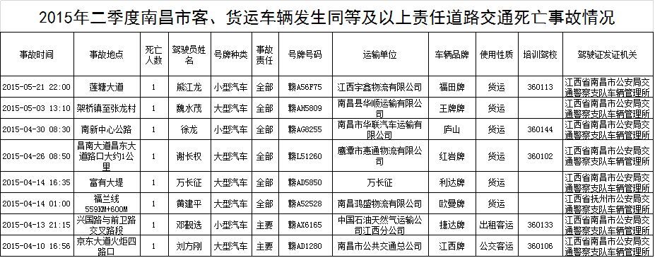 央廣網(wǎng)江西分網(wǎng)6月25日消息(邱小波 通訊員 戴偉)25日,南昌市交管局曝光了2015年第二季度發(fā)生一般交通事故的客貨運車輛企業(yè)。據(jù)統(tǒng)計,今年4-6月份共有8輛客貨運車輛發(fā)生死亡交通事故,致8人死亡。