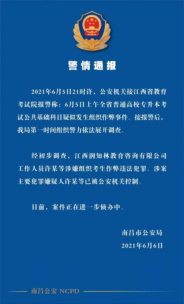 6月5日21時(shí)許,南昌市公安局接到江西省教育考試院報(bào)警稱(chēng):6月5日上午全省普通高校專(zhuān)升本考試公共基礎(chǔ)科目疑似發(fā)生組織作弊事件。接報(bào)警后,南昌警方第一時(shí)間組織警力依法展開(kāi)調(diào)查。經(jīng)初步調(diào)查,江西潤(rùn)知林教育咨詢(xún)有限公司工作人員許某等涉嫌組織考生作弊違法犯罪。涉案主要犯罪嫌疑人許某等已被公安機(jī)關(guān)控制。目前,案件正在進(jìn)一步偵辦中。