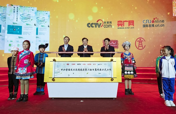 2018年12月23日下午,中央廣播電視總臺(tái)、教育部、國(guó)家語(yǔ)委聯(lián)合舉辦“中小學(xué)語(yǔ)文示范誦讀庫(kù)”第二季作品發(fā)布會(huì)。中宣部副部長(zhǎng)、中央廣播電視總臺(tái)臺(tái)長(zhǎng)慎海雄,教育部副部長(zhǎng)、國(guó)家語(yǔ)委主任杜占元,中央廣播電視總臺(tái)副臺(tái)長(zhǎng)閻曉明出席發(fā)布會(huì),并共同見(jiàn)證第二批100篇音頻教材正式上線發(fā)布。新華社記者沈伯韓 攝