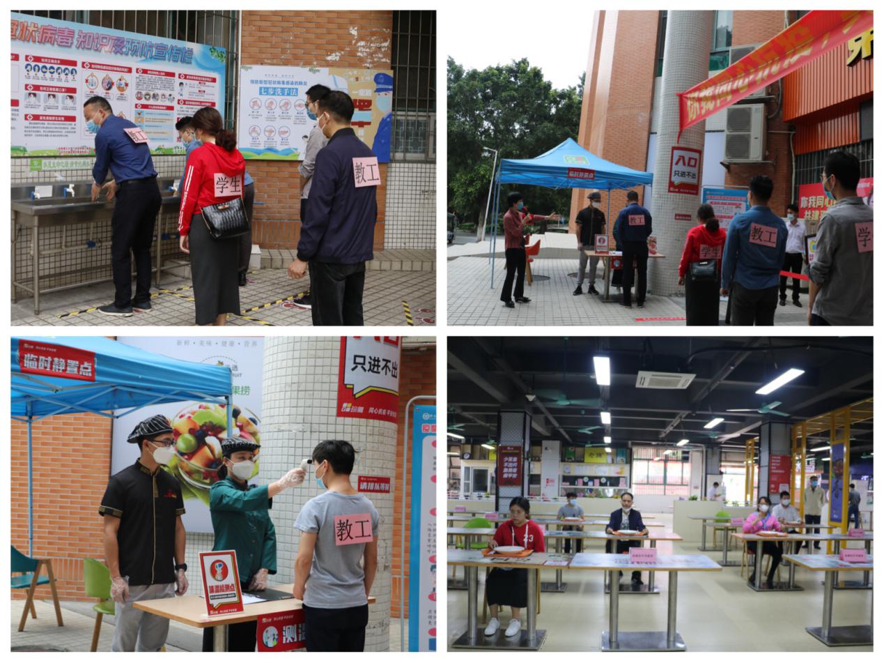 食堂進(jìn)出口分離,嚴(yán)格管控,標(biāo)識(shí)清楚,由正門進(jìn)入,保持1米安全距離行動(dòng),并從專門出口離開。參演師生佩戴口罩,在食堂入口的洗手池處,根據(jù)7步洗手法清洗雙手,然后來到測溫崗前的排隊(duì)區(qū)域,根據(jù)間隔標(biāo)識(shí)有序排隊(duì)等待測溫。用餐者出示有效證件(校園一卡通/學(xué)生證),測溫人員確認(rèn)后測量其額溫,體溫正常者按引導(dǎo)線有序入場。為預(yù)防餐具污染,設(shè)專人發(fā)放消毒餐具。