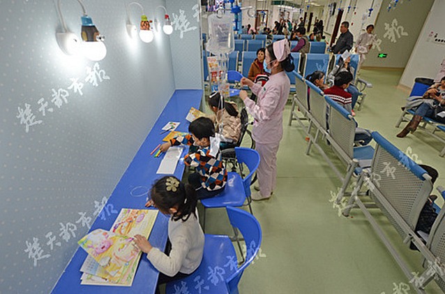 在一排可愛(ài)的驢頭護(hù)眼燈下,幾名小朋友掛著吊瓶端坐在輸液室的一角,趴在桌前或閱讀或做作業(yè)……這是武漢市第三醫(yī)院光谷院區(qū)兒科門診內(nèi)的一幕。今天,該院在武漢率先開(kāi)設(shè)兒科輸液室書香一角,方便學(xué)生打針時(shí)兼顧學(xué)習(xí),堪稱醫(yī)院里的“吊瓶班”。