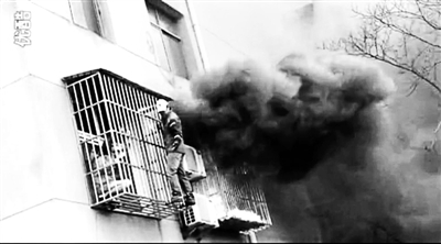 在這條10分鐘左右的視頻中,一棟居民樓中的一間屋子著火,火苗已躥出窗外,并伴有大量黑煙。在著火屋子的隔壁房間,一名女子站在陽臺防盜網里等待救援。而在防盜網外,一名身穿紅色外套、頭戴白色帽子的男子,沿著防盜網之間的空隙慢慢移動,試圖救出這名女子。