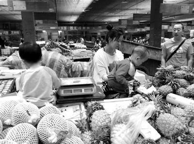 在新民菜市場(chǎng),其他菜販的還未到上學(xué)年紀(jì)的孩子在李霞的攤位上嬉戲。