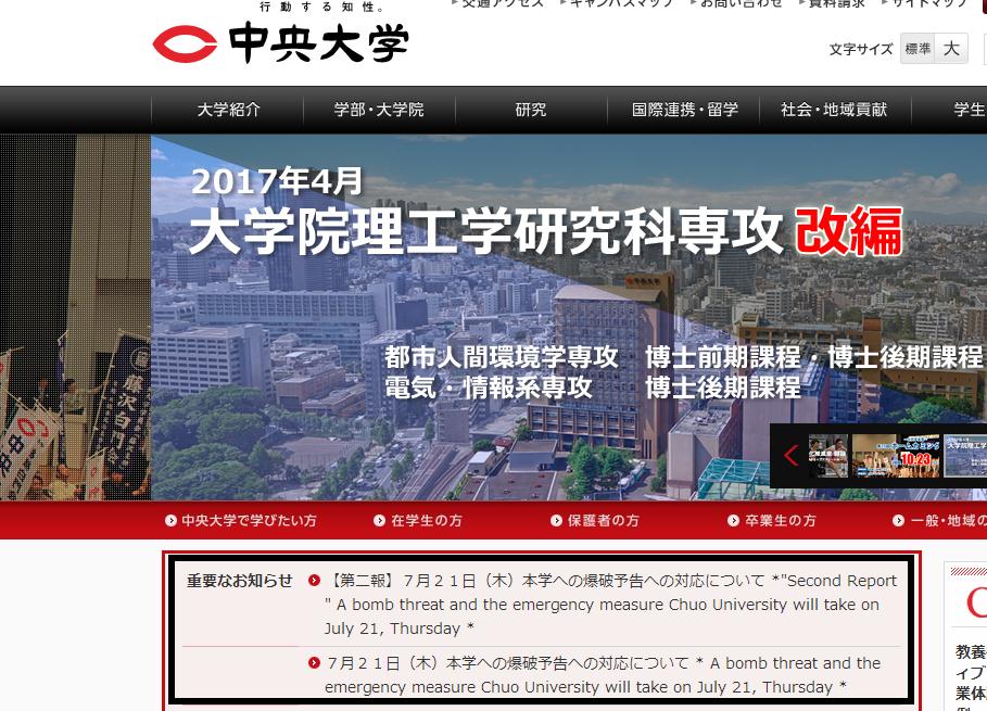 《日本新華僑報(bào)》總編輯蔣豐21日上午微博發(fā)布消息稱,今天,日本中央大學(xué)的主頁上顯示,學(xué)校收到了恐怖分子的炸校通知,聲稱將于本日10:30(北京時(shí)間11:30)引爆中央大學(xué)。消息稱,校方為避免學(xué)生傷亡,臨時(shí)決定緊急停課。